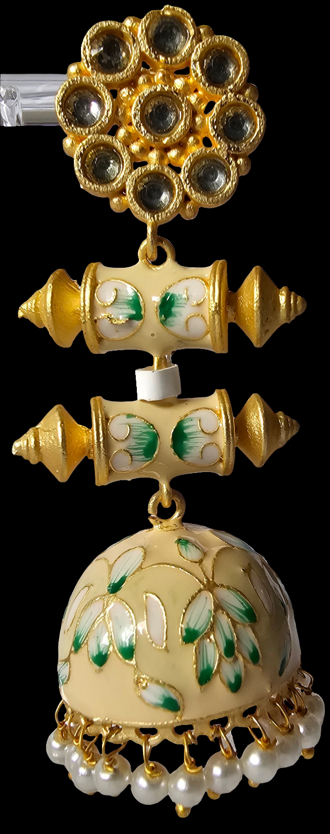 Elegant and timeless, these jhumki with flower earrings feature intricate enamel work, sparkling kundan stones, and delicate pearl accents. Perfect for weddings and festive occasions, they blend traditional charm with refined craftsmanship for a standout look.
