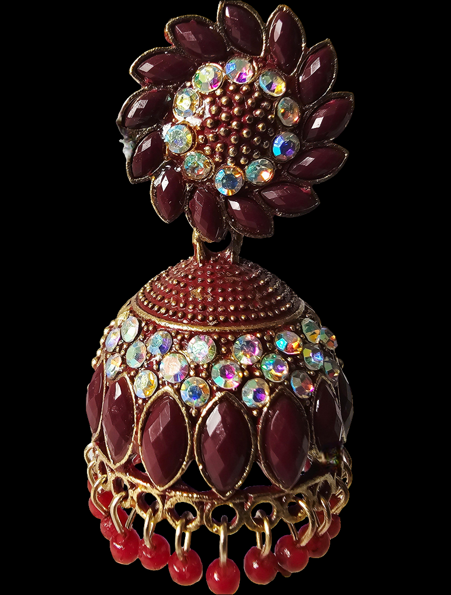 Elegantly designed with a floral motif and antique gold finish, these jhumka earrings sparkle with ruby and white stones, adding a regal charm. Ideal for festive occasions or as a timeless gift.